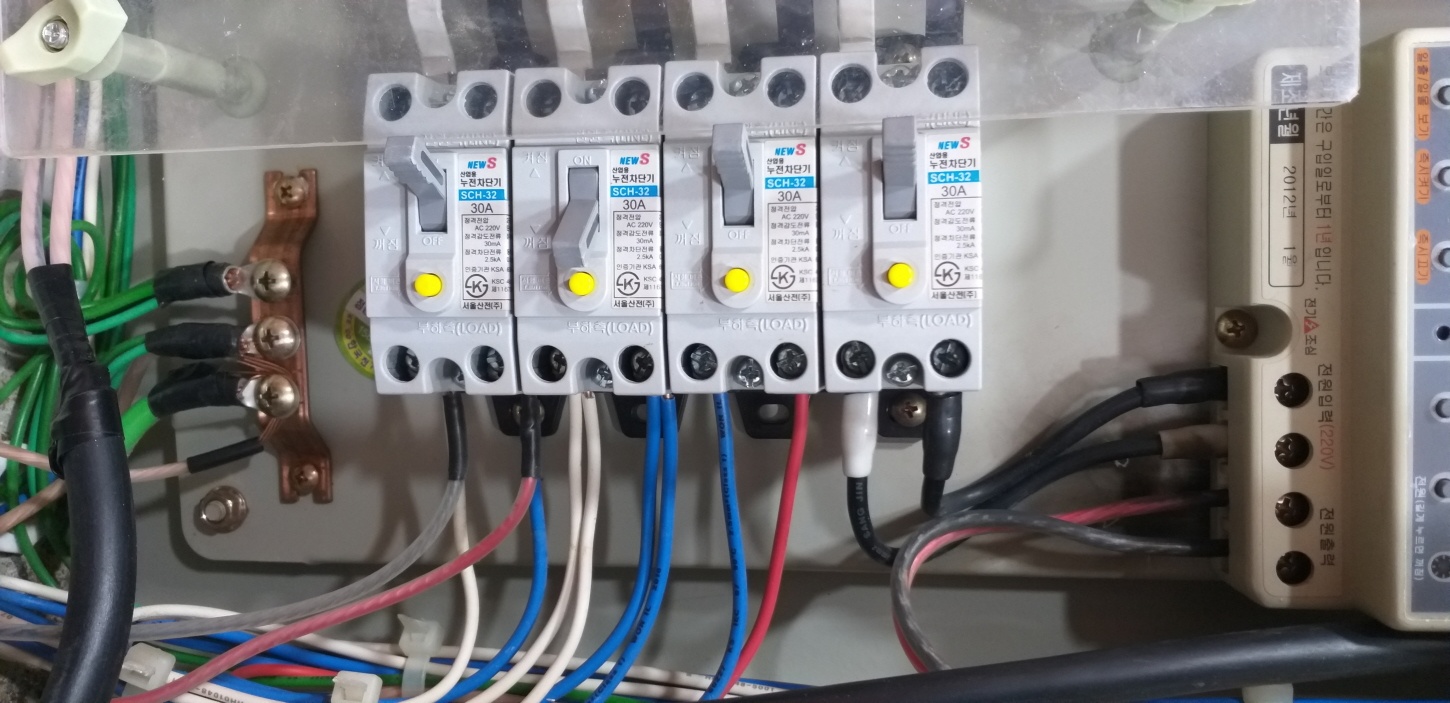 0316 #송파레미니스A전기공사 차단기함(분전함)의 구조는 몇 년 전에는 맨 좌측에 누전차단기(보통30A)를 설치하고 그 오른쪽으로 배선차단기(20A)를 여러개 설치 합니다. 010-6283-5775전기이팀장