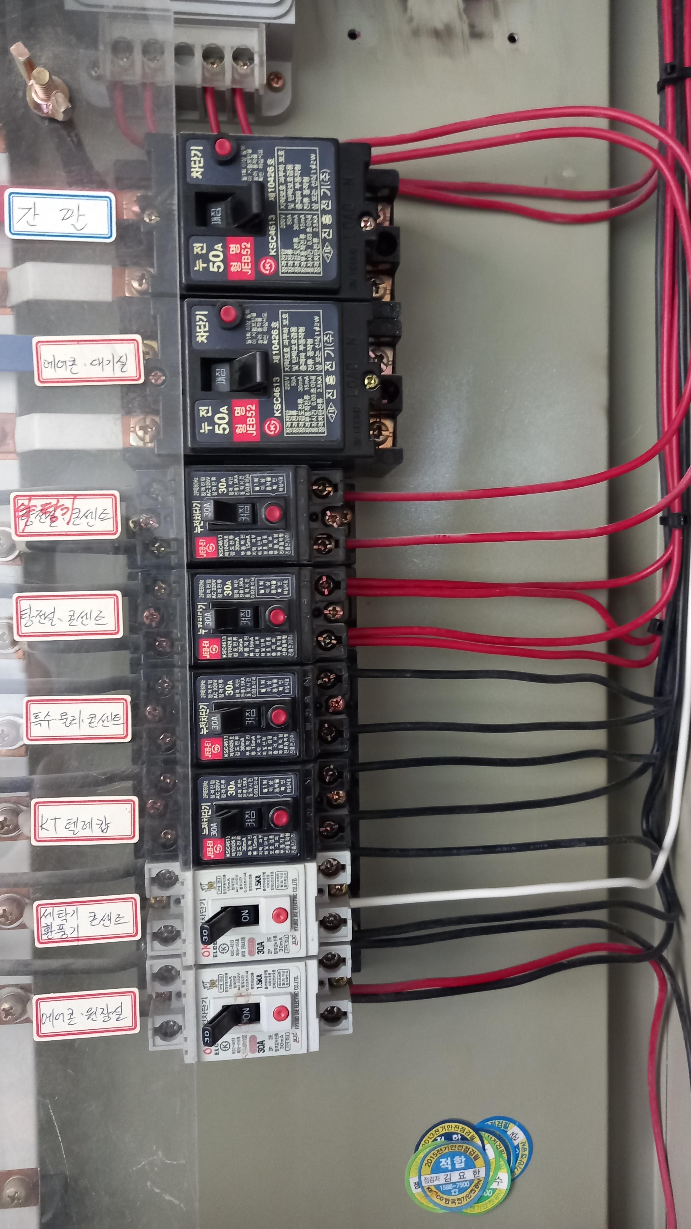 몇년 전에만 해도 메인이라하는 맨 왼쪽에 누전차단기30A가 설치되고 오른쪽으로 20~30A의 과부하 차단기가 설치되어 있었습니다. 보통은 차단기 색깔이 검정으로 되어있고 버튼도 초록이나 빨강으로 되어 있었네요.